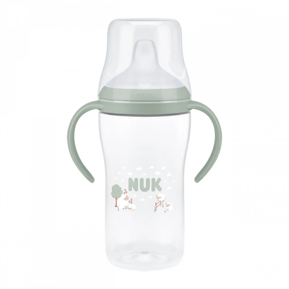 Lahvička na učení NUK Perfect Match s měkkým silikonovým pítkem a kontrolou teploty usnadňuje přechod z lahve na hrneček pro děti od 6 měsíců. S protiskluzovými rukojetmi a technologií Anti-Leak je ideální pro samostatné pití doma i na cestách.